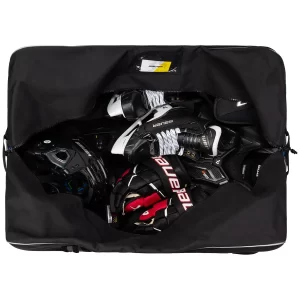 The Bauer Core Wheeled Bag is ideal for the casual ice or roller hockey player who plays maybe once a week and needs something affordable yet durable. The exterior is built with heavy-duty polyester and PVC backing for great durability, and a lightweight and comfortable carrying experience. The bottom boasts a strong and sturdy plastic base with two rubber wheels to transport your gear to and from the rink with less hassle.